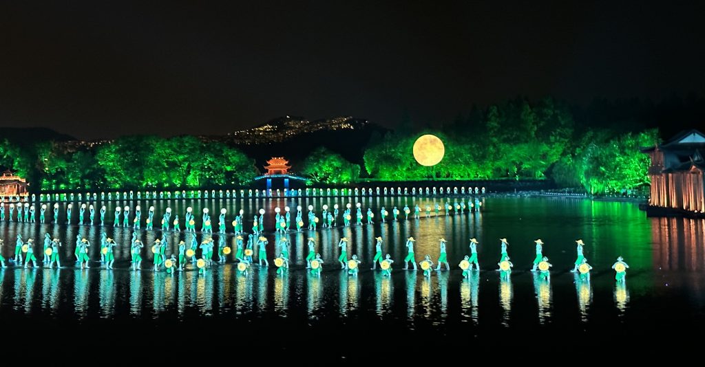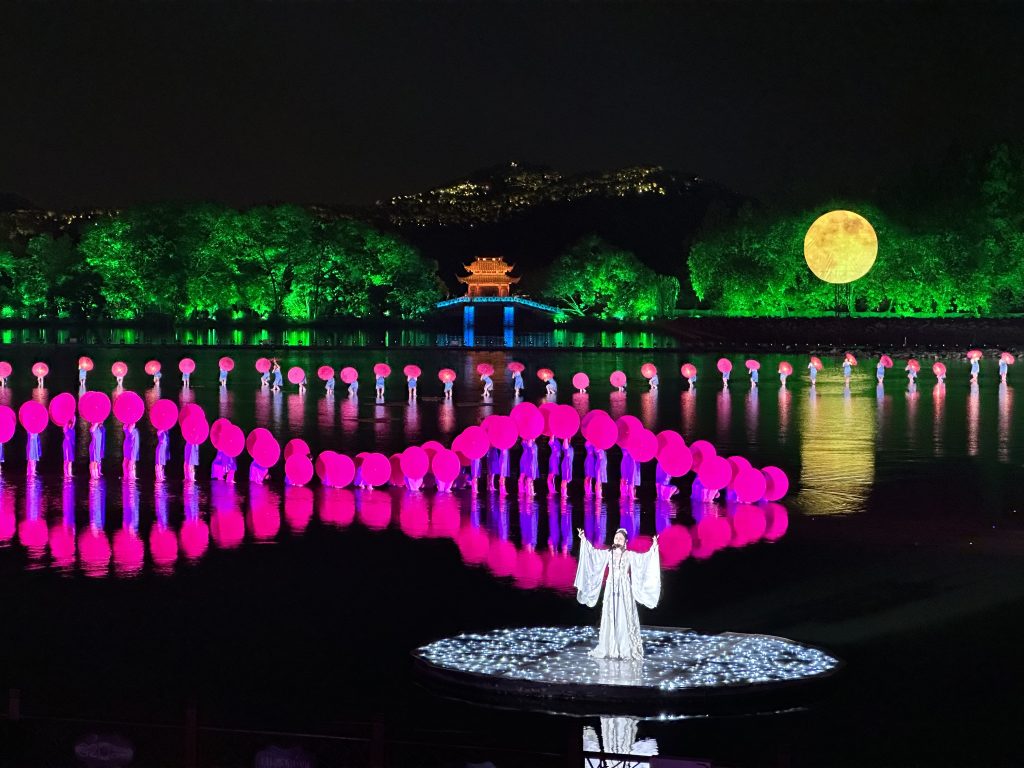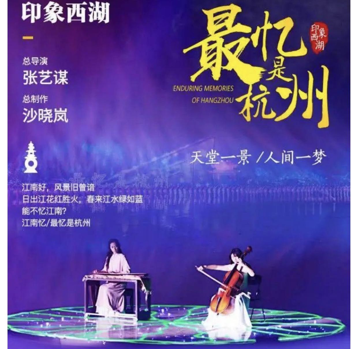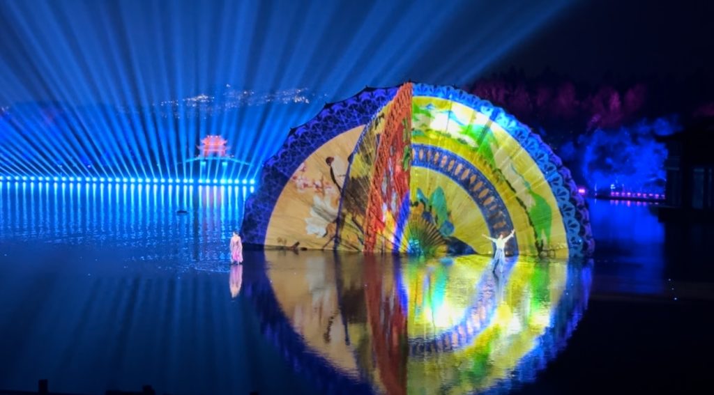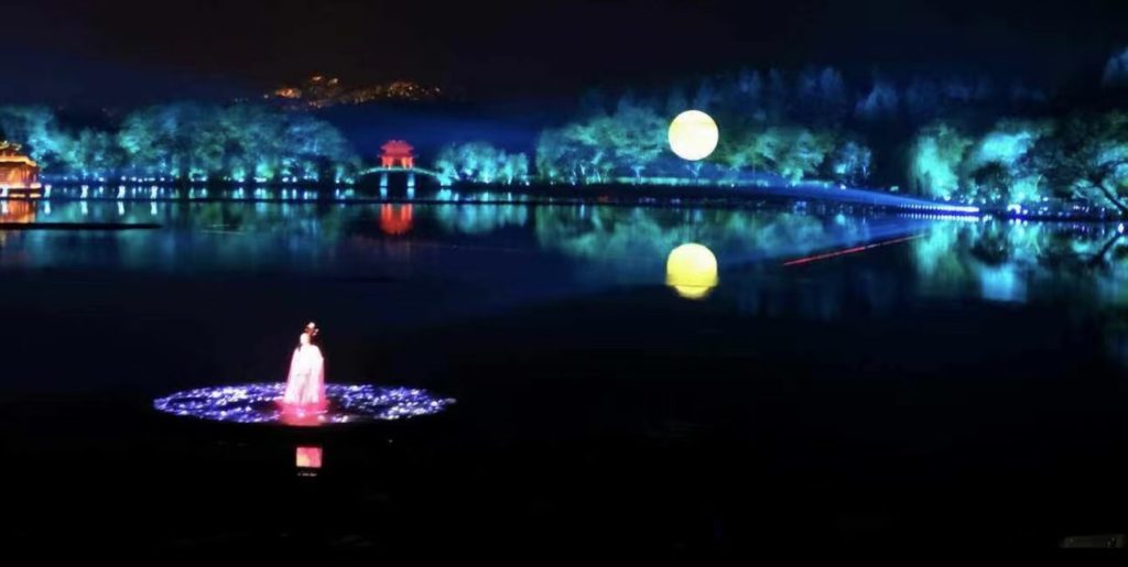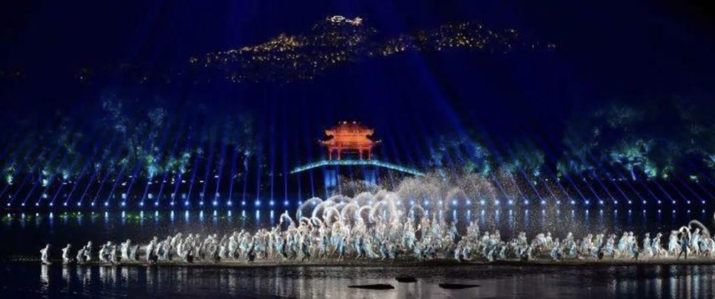 ”最忆是杭州“以舞蹈、歌唱、杂技等多种艺术为主线,通过柔美的西湖水面精美的舞台设计,结合现代全息3D投影技术,伴随优美音乐,把西湖的神话、传说以及历史代表性的元素的杭州自然风光和人文景观,从断桥残雪到曲院风荷,从平湖秋月到苏堤春晓,包括宋代的江南水乡、明清时期的商市风情、民国时期的西子湖畔等场景如诗如画般生动重现,美轮美奂,恍惚进入一个千年梦幻般的仙境,穿越了灿烂的历史长河。