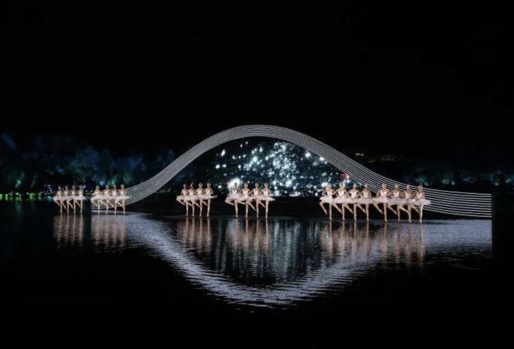 第五曲《天鹅湖》古典芭蕾舞的典范,将“天鹅湖”的经典芭蕾舞蹈放置进“西湖”的景观之中,让“天鹅湖”演员在西湖水面舞台全息投影美满结合,完成亦幻亦真、真假难辨的舞蹈交辉呈现,形成了中西合璧的别致意境。惊喜纷呈,百看不厌。