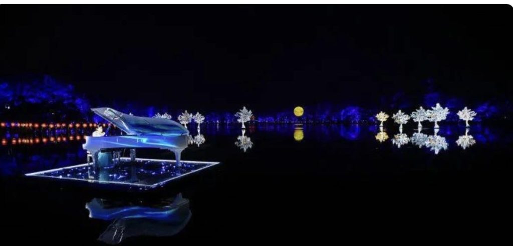 第二曲《采茶舞曲》作为杭州代表性的民间小调,《采茶舞曲》与开篇《春江花月夜》水乳交融、无缝连接。在西子夜色中,漫山遍野的采茶女,身穿江南传统服饰、清丽柔美、古韵婀娜,整个西湖随之欢乐律动。“欲把西湖比西子,淡妆浓抹总相宜。“撩人心动。