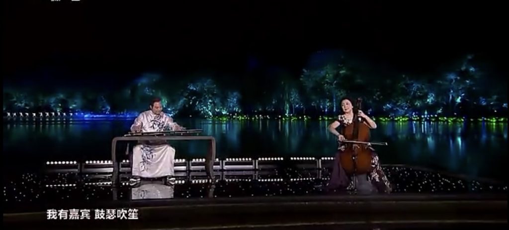 第四曲《高山流水》 中国十大古典名曲之一。古琴,具中国气韵的乐器,其滚拂手法淋漓尽致地表现了流水的滚动、漩涡、湍急等景象,宛如身临其境。而东方古琴与西洋大提琴的激荡交融,清澈的童声吟诵《诗经·小雅》的名篇:“呦呦鹿鸣,食野之苹,我有嘉宾,鼓瑟吹笙……”古往今来,礼仪之邦的热情好客、重情重义的优良传统。